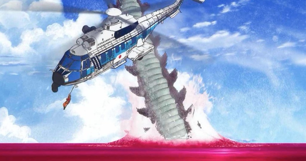 Still, the variety is admittedly kinda cool with the opening scene of a daring ocean rescue occuring as Manda tails rise from the sea and thrash about, spraying sea water dramatically in an impressively cinematic feat of animation. On the other hand, the announcement that yet more Rodan’s have arrived is somewhat downplayed, but as we’ve already experience a full scale attack, this is a totally a smart movie, however, the big news is we’ve got two news redesigns of classic Toho creatures to cast out eyes over and both are noticable but for very different reasons.