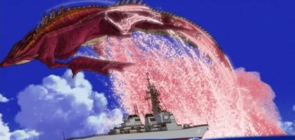 However, retroactively saving the day is 2016’s Shin Godzilla, a movie that’s already floated the concept that Godzilla is an ever-mutating lifeform, so the concept of our titular star sneaking into the show under the guise of another creature isn’t exactly new and a prompt metamorphosis is surely on the cards. Still, even though the creature technically isn’t Titanosaurus (much like how Salunga technically isn’t Gabara), he still gets a genuinely impressive hero moment as his immense mass explodes out of the water to perform a spectacular Free Willy moment on a naval vessel.
