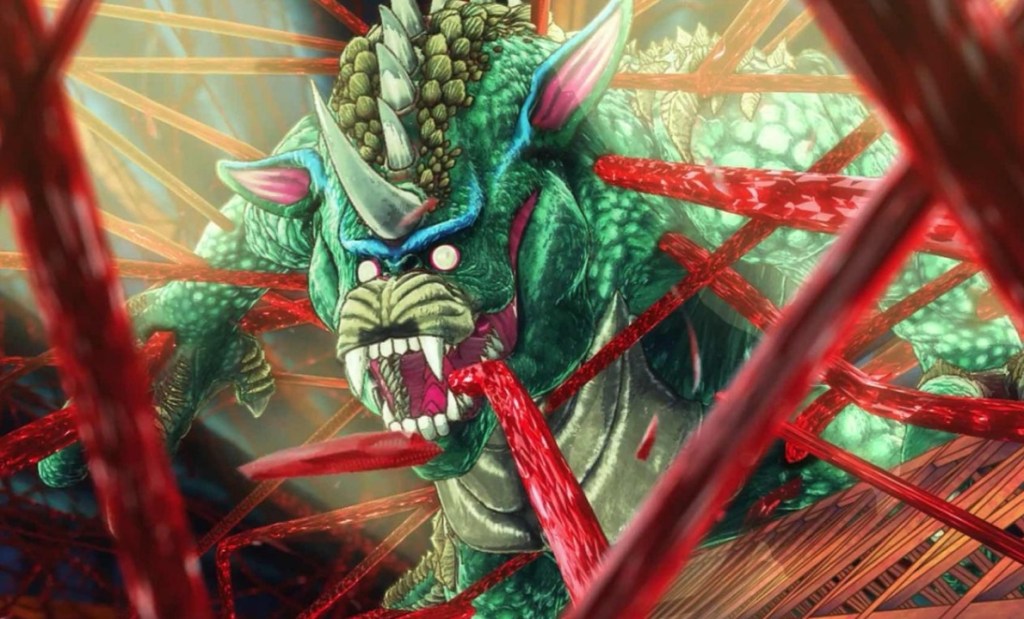 The world is agog as the huge, aquatic creature that’s been chasing the snake-like Manda’s throughout the ocean finally catches and kills one and then, in a cloud of red dust, emerges on land and proceeds to switch to a form more suited to rampaging on solid ground. Elsewhere, yet more red dust is being scattered around the globe by countless Rodans as their numbers continue to swell and the seem to now be resistant to suddenly dying after spending a certain time in our atmosphere. Finally, the horned, brawny Salunga is still trying to punch it’s way out of the containment unit that’s stopping him from unleashing yet more red dust all over India and there’s only a bunch of rocket launching soldiers dangling precariously on ropes that’s standing in it’s way. So what are our scattered heroes doing about it? Having yet more discussions about time travel, alternate realities and theoretical weapons of course. However, despite my glib jab, it seems that seven episodes of scientific musing is getting ever closer to having an answer as a discussion between Mei and Li reveals that the confounding element known as archetypes are actually made from the red dust and they’ve been mined from special mineral veins called Singular Points (someone finally said the thing!). Furthermore, missing beardy weirdly Professor, Ashihara once predicted that destructive monsters would emerge from the red dust to wreak havoc and it falls in line with an ancient prophecy Mei is familiar with. The only thing that can halt the spread of the red dust is the mythical thirteenth and final stage of the architypes known as the Orthogonal Diagonalyzer, a state that cannot possibly exist this soon in history – but if that’s the case, why are the bigwigs in the Indian facility about to use something with that name against Salunga?