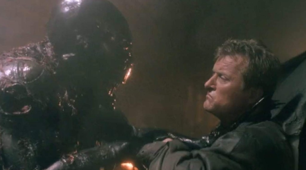 Utterly ludicrous and hilariously overblown, Split Second, with its utterly bizarre Predator 2 meets Se7en plot, frequently lurches into so bad it’s good territory, you’re not entirely sure if the whole enterprise isn’t supposed to be some sort of spoof, but no one on set realised it until it was too late. The main source of unintentional laughs can be found with Rutger Hauer’s impressively tic-laden performance as Dectective Harley Stone – a burnt out detective so stereotypical Hauer seems to be deliberately playing him as some sort of grotesque parody. Checking off the basics such as a long coat, an unfeasibly prolific smoking habit and a cartoonish distain for anything even remotely resembling authority, Stone also lives in an apartment so dilapidated, pigeons openly flutter about the place and he keeps turning up to work despite being repeatedly told he’s been suspended. However, the most amusing aspect of Hauer’s performance is that Stone, since giving up drinking, has taken to assaulting his nervous system with enough sugar and caffeine to push a sloth to brake the Olympic record for the 100 meter sprint. As a result, it give the legendary Dutch, Guinness sipping thespian free reign to be as unhinged as he can be for the entire film. Hey, if nothing else, the moment when he gets his straight arrow partner hooked on caffeine and the two both stride around an armoury repeating the phrase “big fucking guns” is undeniably a silly hoot.