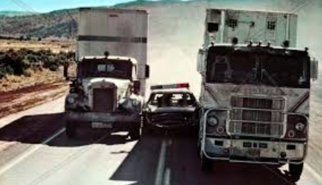 Perma-squinting, bearded, living legend Martin Penwald is a trucker who goes by the well-known handle of “Rubber Duck” and spends his days roaring up and down the blacktop of Arizona, hauling goods to make his living. However, his simple life hits a moustachioed speed trap in the shape of the corrupt, gap-toothed sneer of Sheriff “Dirty” Lyle Wallace, who has taken to padding his wallet by posting false reports on the C.B. radio, telling truckers that they’re clear to break the speed limit and then busting them in person for speed limit.