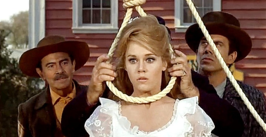 It’s not like there hadn’t been other tonally diverse Westerns before or since Jane Fonda first tentatively approached that hangman’s noose; after all, Mel Brooks infamous, establishment baiting spoof, Blazing Saddles and the truly bizarre experience of seeing Clint Eastwood and Lee Marvin warble their way through the musical, Paint Your Wagon, instantly comes to mind, but when it comes to a comedic balancing act, Cat Ballou boasts some impressive credentials. Cross pollinating genres takes a steady hand. For example, for every horror comedy that hits the bullseye of An American Werewolf In London and actually score both legitimate scares with its chuckles, you get at least five Lesbian Vampire Killers that provides neither, so it’s a testament to Elliot Silverstein’s direction and the savvy nature of the script that Cat Ballou confidently stands with a ladies’ sized cowboy boot planted in each genre. Good naturedly ribbing the tropes of a fair few gunslinger movies, the film deals up broad examples of stock characters like the over the hill, alcoholic sharp shooter or the overexcited young male who thinks more with bis pecker than he does with his grey matter – but wisely never mocks them or belittles them. The result is that, despite its colourful and undeniably theatrical demeanour, the movie still plays respectfully within the rules of the Western while simultaneously flipping some other tropes like a burger on a grill.