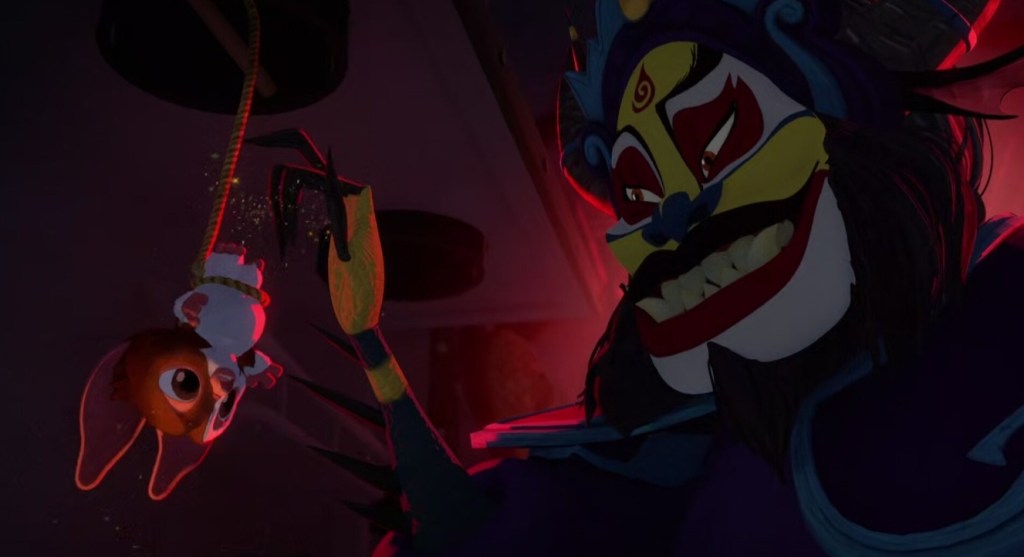That leaves OddOdd, a character who, along with spell casting rotter, Riley Greene, is yet another, giant step into the realm of full blown fantasy and the show manages to pull it off nicely. Yes, having a shape shifting villain appear just when the show needs a single serving baddie to drive a temporary wedge between our heroes may smack of A to B storytelling, but it’s attacked with the same colour and energy that the writers, directors and animators have aimed at everything else so far. OddOdd is a striking design that has obvious nods to Chinese theater with a nicely absurd backstory that literally casts him as an egotistical actor who just happens to be a spine throwing monster who has a taste for Mogwai à la carte and Park’s sardonic vocals bring a wry humour to a beastie who could have just been another throwaway nogoodnick.