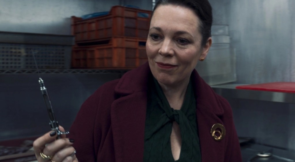 Next is probably the most devastating meeting of all as Fury is effectively shit-canned by an unrepentant Rhodey who goes about his task in merciless fashion. While it could be argued that War Machine himself could been a Skrull, the politically and social charged comments the two men deal.out to each other concerning race, power and what it truly means for a black man to carry that much political heft tells me that Marvel wouldn’t let such a loaded and seismic discussion be delivered by a man who’s skin is actually green. The last meeting is techinally a far lighter one in tone, even if it does involve torture and finger-snipping and it involves Olivia Colman’s still delightful Farnsworth as she channels Imelda Staunton’s Dolores Umbridge as she cheerfully injects a Skrull agent with a concoction that literally makes his blood boil.