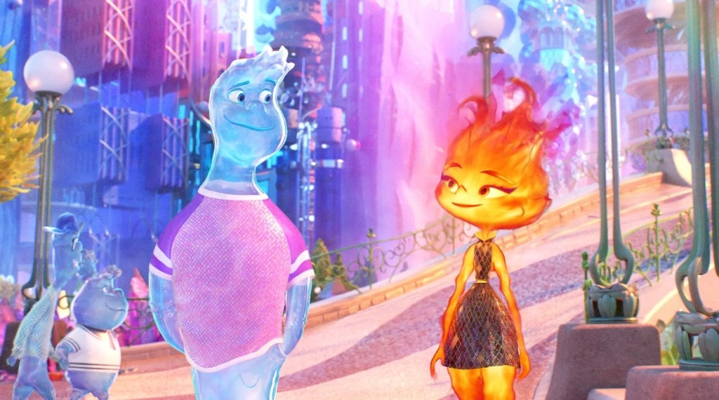 The notion of anthropomorphized elements falling in love in a city comprised of earthy, windy, watery and fiery beings just trying to get along is just so inherently Pixar, I’m genuinely amazed that the studio has taken this long to get this concept on screen. Making a mockery of the fact that computer generated imagery once struggled to convincingly render water or fire by making them the leads of an animated rom-com, Elemental is yet another feast for the eyes as details both great (wind people crackle with lightning when angry) and small (note the T-Shirt that bears the legend “Kiss Me, I’m Fireish”) dance before you with unlimited imagination that once again reveals why the animation giant is virtually unparalleled when it comes to world building. And yet, as layered and conceptually beguiling as Elemental is, there’s a cloud on the horizon that takes that stunning imaginative streak and makes it look strangely dated. After two animated Spider-Verse movies that literally tore up the rule book and essentially beat Pixar at their own game by throwing in changing frame rates and animation styles to bolster the medium to new heights, Elemental seems a little… quaint. Worse yet, you’ll find yourself picking unnecessary holes in the nature of Element City – such as why is some water alive and other water is just water and if air is a living thing, what’s providing the oxygen for fire to burn? These are hardly movie ruining questions, but thoughts like this never materialized while I was watching Inside Out or Finding Nemo.