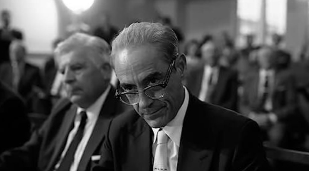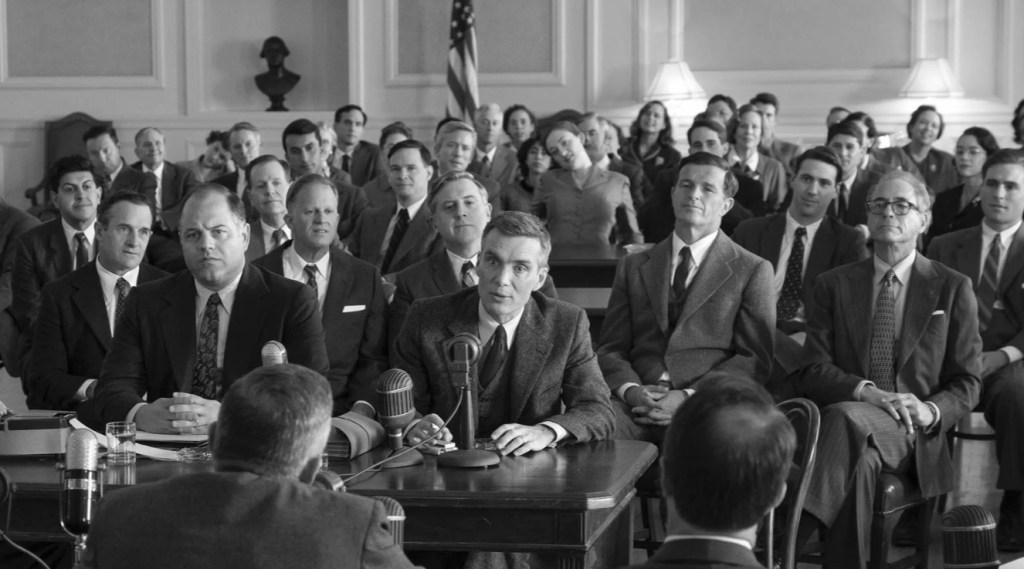 This, unsurprisingly, rears up to bite him on the Oppenheinie years later as other time skips deal with the ramifications of some of the later political pleas of the “father of the atomic bomb” that ruffle some feathers as sees him weathering a hearing designed to strip him of his credibility. This is twinned with the machiavellian actions of the bitter Lewis Strauss who’s dislike and jealousy of the man he marked as his professional and personal enemy, plays out over the years.