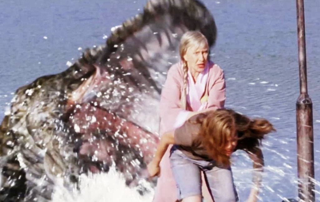 Still, they’re more engrossing than the cartoonish crocs, who never once look like they’re connecting with their surroundings, even when they have one of the faceless teens locked in their jaws. Although, I will concede that the attempt to keep the spirit of Betty White’s endearingly foul mouthed, croc feeding Dolores alive in her on-screen sister is an admittedly neat touch.