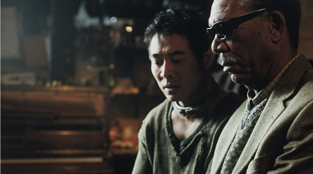 Still, at least his actors are fully game, even if they assemble to make possibly the most random cast ever seen in an action movie. Still mired in the American section of his career, action demigod Jet Li is obviously stoked to act as completely different to his usual fare that gives him an irregular character to sink his acting chops into. To give him his props, he does a great job and he balances the childish nature of Danny with the usual, violent graceful bludgeoning people have turned up to see. Elsewhere, not only does Bob Hoskins ham things up magnificently, verbally bollocking everyone within earshot and groping whores on top of Danny’s cage, but for some reason, Morgan Freeman has found himself involved in this movie as the big hearted, blind musician who takes Danny in. Like Hoskins, he seems to be playing a greatly exaggerated version of the type of wise man roles he’s usually famous for and he seems genuinely enjoying milking the whole sightless musician thing. However, a young Kerry Condon (The Banshees Of Inisherin) throws things even further into the realms of the bizarre as a eighteen year old, American music student who comes armed with an accent right out of Saved By The Bell. While she’s probably simply delivering a larger-than-life performance in order to try and match the tone, her character raises a couple of strange issues. You see, the script has her and Danny start up a romance, however, in the script Danny is supposed to be twenty while Li was creating forty when this movie was made which raises some uncomfortable issues if you are privy to said information. This, along with a legion of plot holes (Bart’s smart enough to train a human being to be an attack dog but hasn’t managed to work out the kinks in fifteen years?), keeps the movie just under the level required for a mindless watch.