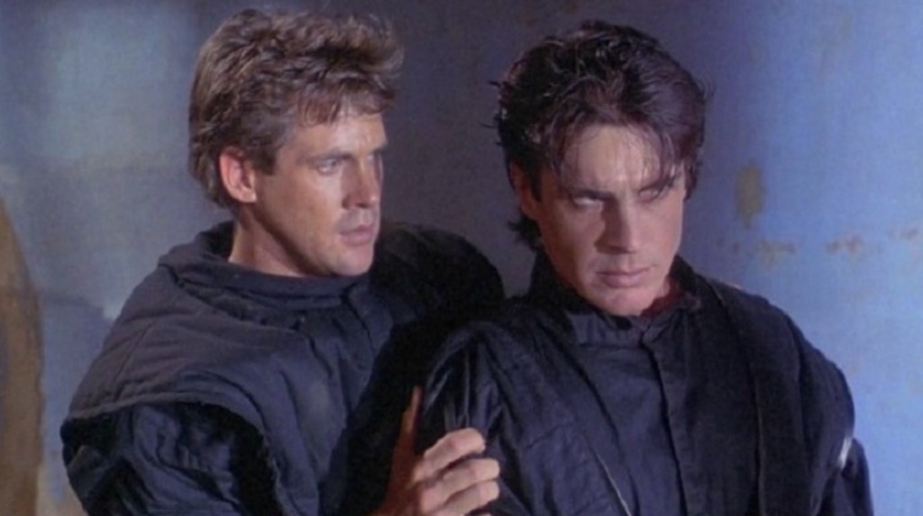 The movie solves the two American Ninjas issue as ungainly and clumsily as you’d expect by having the first half of the film focusing on Bradley’s Sean doing his best to save the day by preparing for battle by doing the splits in front of his bow and arrow and roundhouse kicking his bloody heart out. But as the “lesser” of the two heroes, he’s doomed to be captured in order for Dudikoff’s Armstrong to launch out of retirement like a greyhound out of a trap and bail everyone out 44 minutes into the film. While it would certainly have made more sense for the two martial artists to team up right from the off, rumours persist that Dudikoff would only do the film if he was portrayed as the more heroic hero of the two. Thus the dueling leads barely spend more time together on the poster than they do on screen and a face/off between the two is revealed as a fake out when a suddenly “evil” Sean is revealed to be a ninja in a rubber mask.