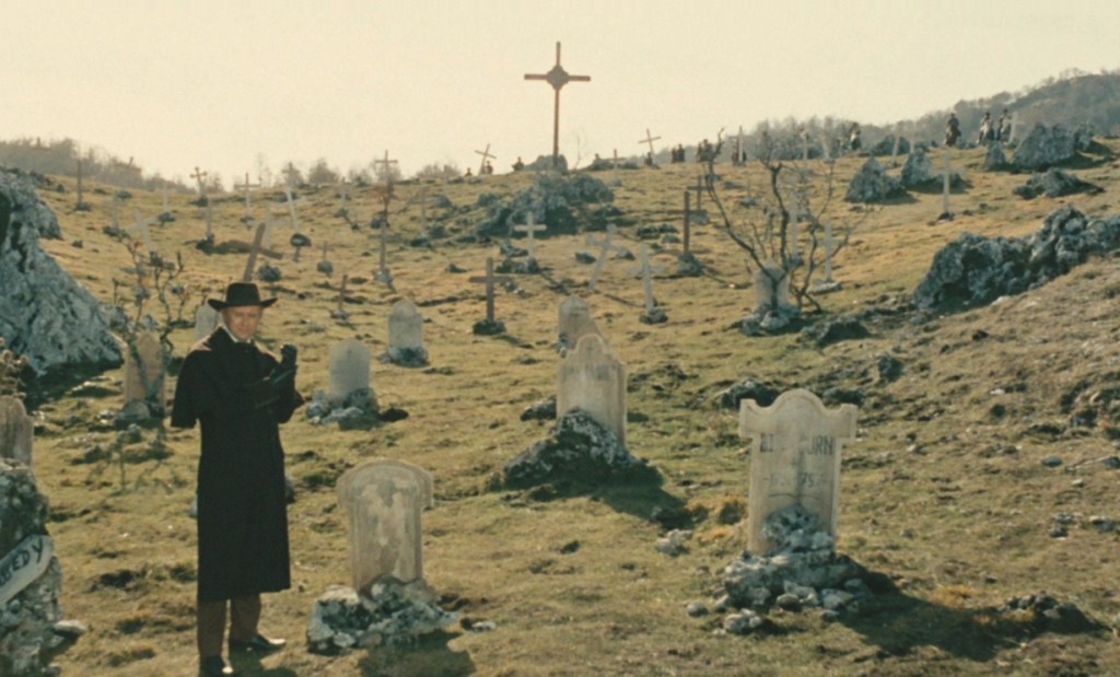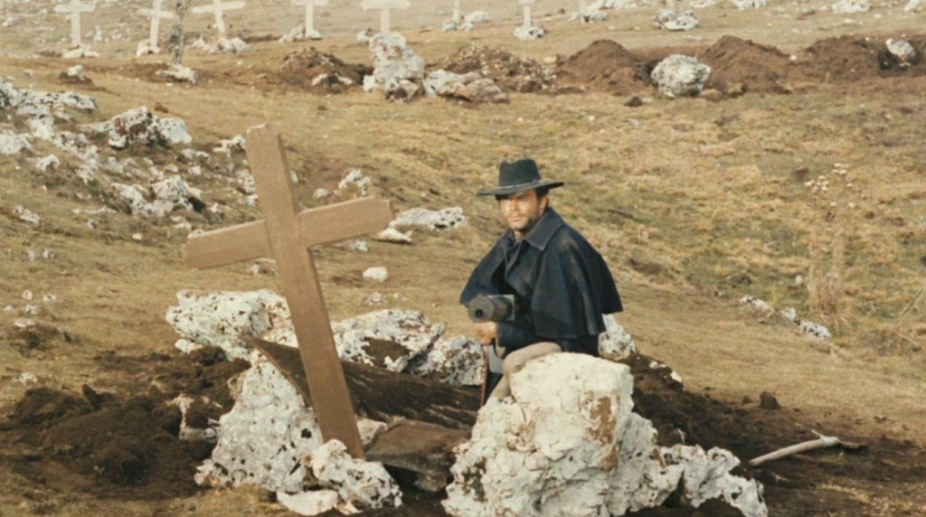 Those who are unfamiliar with the plot of tour average Django movie may be unprepared for how quickly and terribly his carefully laid plans fall apart, but if the lead isn’t discovered and brutalized by the black hats, then it technically isn’t much of a Django film, but it’s that perseverance in the face of failure that usually makes the character. Less we forget, Franco Nero’s version had to out shoot his enemies with two, completely shattered hands and even though Hill hasn’t got to contend with anything close to being that vicious, that vague, gothic tone is dutifully adhered to in the final scenes when the villians surround our hero as he digs up his own grave, only to reveal that his coffin contains this trusty and iconic machine gun.