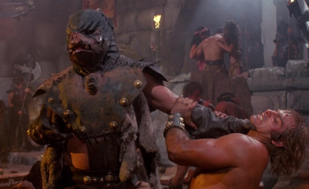 I mentioned earlier on that fantasy movies of this time period are a little strange to figure out as their near unending displays of sex and violence tend to sit awkwardly with plots that tend to be so idiotically childish; but the better ones (Conan the Barbarian, I’m looking at you) usually work by creating a bizarre world that’s at least a little tangible.