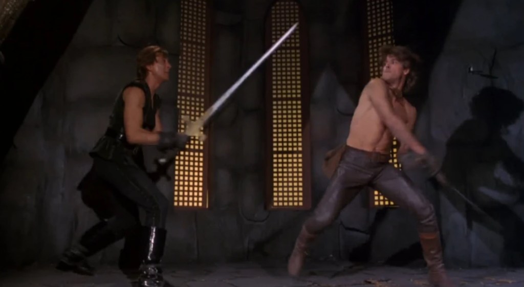 It sure ain’t subtle, but it is fun in a self deprecating way as Deathstalker, now played by a perma-smirking John Terlesky, has become a vain, preening scoundrel who us constantly obsessed with his hair. “Ordinarily, I dont mind seeing a woman get a good beating if she deserves it.” he smugly declares after saving Reena’s bacon from the first of many attempts on her life and later he further cements his prick status by describing his outlook on life as “I rob from the rich, and pretty much keep it for myself.”.