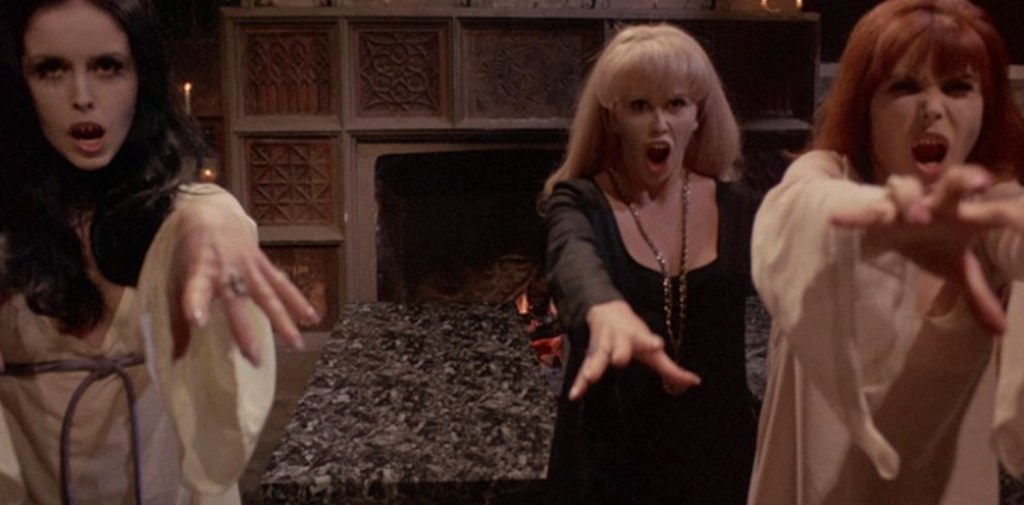 While I would hardly claim that the film has the same effect today as it would have in some flea pit cinema or – in my case – catching randomly at twelve years of age on late night TV, there’s moments that are genuinely freakish. Granted, the sight of a clearly middle-aged man with fangs suddenly lurching into frame with his arms outstretched doesn’t sound like the true face of terror, but the screeching score and the low budget starkness of it all gives it an eerie feel that gets under your skin. A face suddenly leering out of the dark through the windscreen of a van will always make you spill even a little bit of your popcorn and a moment where one of Yorga’s brides to be screeches after unknowingly feasting on a kitty is also successful raising the old heart rate.
