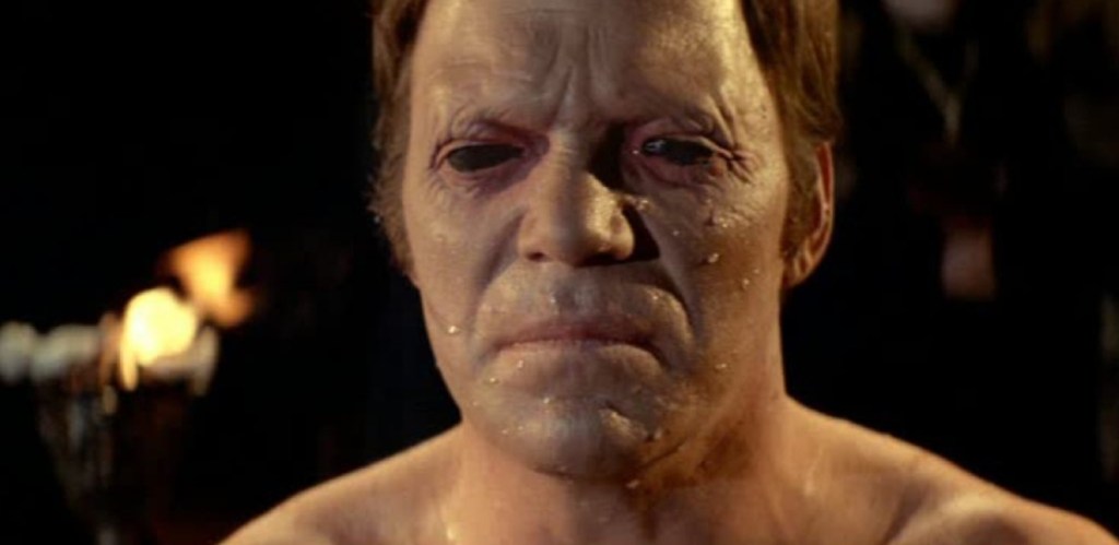 At a razor tight 86 minutes, Fuest goes all in to deliver a truly berzerk example of American Gothic that, at turns, alternates entertainingly between being borderline goofy and genuinely creepy and immediately puts this into practice with an opening scene that Thrones in everything but the kitchen sink. There’s a pounding storm, mysterious intrigue, William Shatner indulging in his patented brand of melodramatic overacting and a dude who melts into a puddle right before our very eyes and that’s all before a bug-eyed, robe-wearing Ernest Borgnine shows up with a taste to consume every bit of scenery he can whenever he appears on screen. When he does, it’s fucking glorious and the whole first half, which sees both Shatner and Borgnine try to match each other’s faith (read: overacting abilities) would have made a super cool, Tales From The Crypt-style short story that ends with Captain Kirk succumbing to the forces of evil and losing his eyes – which amusingly makes him look exactly like the Michael Myers mask that would dominate the genre two years on.