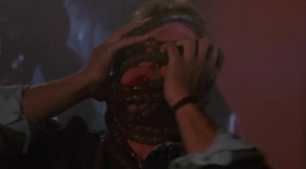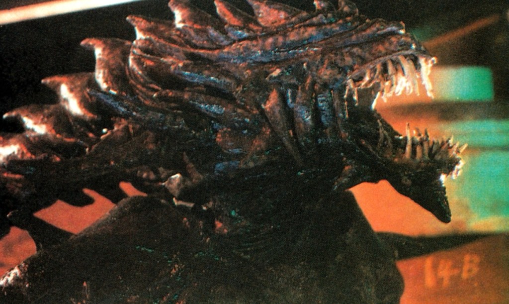 Now, before we start, let me point out a few things – firstly the movie isn’t even set in shallow space, let alone deep space and the movie doesn’t even techinally feature an alien as it does a man-made creation, warped by the finky, cosmic hocus pocus of space, Blob-style. And yet, when the creature raises its suspiciously familiar looking, elongated head and roars at the camera, there’s no doubt that Olen Ray is in full Grand Theft Giger mode.