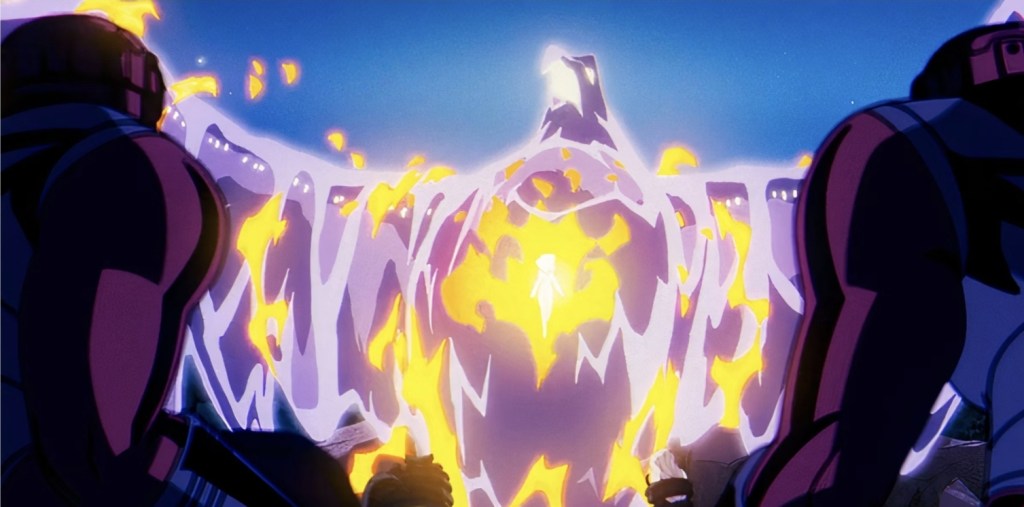Anyway, back to the carnage and as not to be outdone by doomsday plots, world devastation and a generous clutch of cameos that even includes Peter Parker and MJ from the 90s Amazing Spider-Man cartoon (so… MJ survived?), the episode takes Bastion and gives him an Anime-style upgrade that sees his final form evolve into a winged dreadnought that seems worryingly resistant to damage. We’ve seen vicious brawls in the past on this show, but it’s good to see that it can still bring the goods when it comes to delivering a bruising final battle in a season full of them. In fact, the modern influence on the classic style of animation goes way beyond what the show was able to show back in the day and the ravaged look of a beaten Bastion, who sports a damaged Terminator visage complete with a bulging eyeball and exposed teeth to really sell the pain.