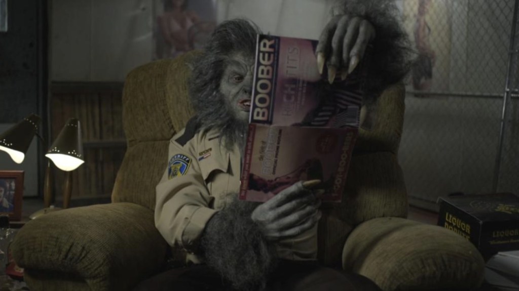 But hey, don’t just take my word for it – there’s a bunch of telling cameos abound that pretty much means that Another Wolfcop gets the trash seal of approval. For a start, none other than Kevin fucking Smith shows up as the booze sucking, bribe-taking Mayor of Woodhaven, who meets a vile end farting and puking himself to death while a google-eyed hand puppet (eg. a Shifter newborn) erupts from his belly like The Mighty Boosh crew was remaking Alien with thrift shop effects. Earlier in the film, Adam Brooks, Conor Sweeney and Matthew Kennedy – the main trio behind defunct Canadian filmmaking team, Astron-6 – show up as criminals who all get ripped to sheds by our titular hero in the opening action sequence and I have to say, if any of the past two sentences made any sense to you whatsoever, it’s a good indication of how much you’re going to embrace another go round of fanged madness.