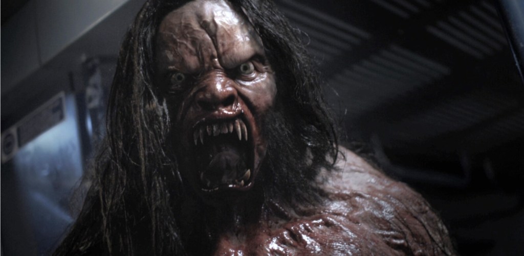 However, when it comes to building a sturdy, survival/horror frame to hang it’s bells and whistles on, Howl manages to do just fine. Sure, the train interiors are all wrong (I’m gonna die on this hill, sorry), but the production values are good enough that this nasty predictiment certainly has enough atmosphere to spare. But the best thing about Howl is the fact that Paul Hyett chooses to approach his werewolves in a slightly different way than the norm and avoids both the more bear-like form of An American Werewolf In London and the biped versions seen in The Howling and Dog Soldiers. Here, the movie opt to take a more wolf man like approach, dropping the more overt animal features in favour of a mixture, we have hulking beast people with gaping, sabretoothed mouths and triple jointed lupine legs that look pretty sweet if you ask me. Also, the hints and suggestions that suggest that the werewolves are actually a family out on the hunt give you enough clues to toy with (one is wearing a wedding ring) without breaking the mystique of where these fucking things have come from.