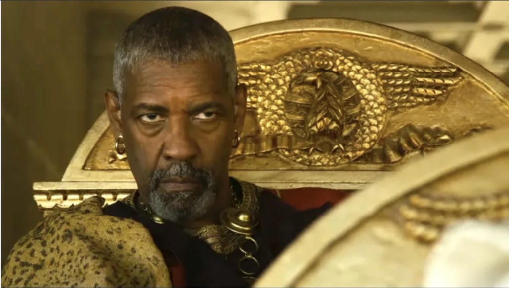 While everyone involved in front of the camera are content to go with the flow, be it a sense of measured stoicism – via Mescal, Pedro Pascal or a returning Connie Nielsen – or a spot of overacting – over to you Quinn and a sex disease addled Hechinger – which fits the piece nicely; however, stepping up and virtually bundling the entire movie under his arm is Denzel Washington, whose performance as the scheming Macrinus somehow proves to singlehandedly equal the crazed visuals that Scott is so effortlessly delivering. Striding around the place, weighed down with extravagant robes and flashy bling and uttering such lines as “I must have power” while fiddling with a severed human head, Denzel just goes to town on the script and you can tell he’s relishing playing another morally vapid string puller arguably for the first time since Training Day. To put it simply, he’s glorious and seeing as the man has recently announced a countdown on his retirement, it’s all the more reason to embrace his performance even tighter while he’s still in the business.