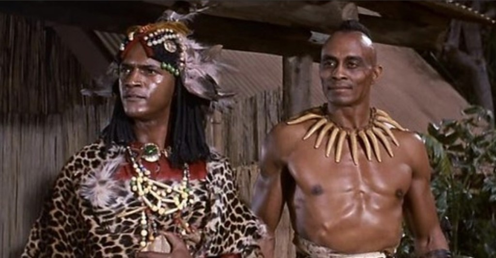While I completely understand that in the context of the story and during the time it was made, such a storyline makes perfect sense and even carries themes of how being so devoutly superstitious and hateful can cost lives, the sight of so many black actors having to mug their way through proceedings clad in face paint and thick accents proves to be a little uncomfortable. Worse yet, the scenes where actual tribes people are used in location footage only further goes to show how gaudy and ridiculous the Hollywood versions are and despite the villainous efforts of James Edwards and Woody Strode, it’s an aspect of the movies that continue to age as poorly as a pitcher of milk left in the middle of the Serengeti. Yes, the film attempts to provide some balance by including complaints within the Nagasu about Futa’s practices and I suppose it means well, but it’s still a movie about white guys teaching black guys the error of their “savage” ways and I can’t help but feel a bit iffy whenever I see it.