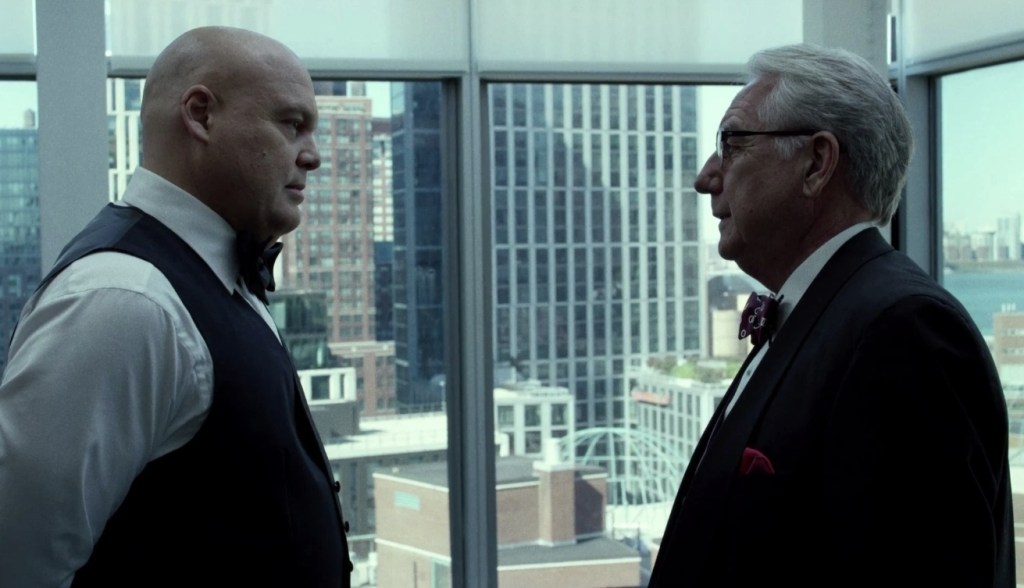 However, while their debate is peppered with flashbacks that boyh establish their friendship and shows us the first time Murdock turned vigilante, it seems that Wilson Fisk is having a high old time. Not only has he seemingly gotten that pesky vigilante out from under his feet, but yet another one of his criminal conspiritors, Nobu, is out of his hair – figuratively speaking, of course – after the fight with Murdock left him ablaze. Of course, this leaves his remaining partners feeling a little concerned, and while money man Leyland Owlsey sucks up to Fisk, Madame Gao warns Wilson that his attempts to oppress the city isn’t going to go hand in hand with his step into the limelight as a pillar of the community.