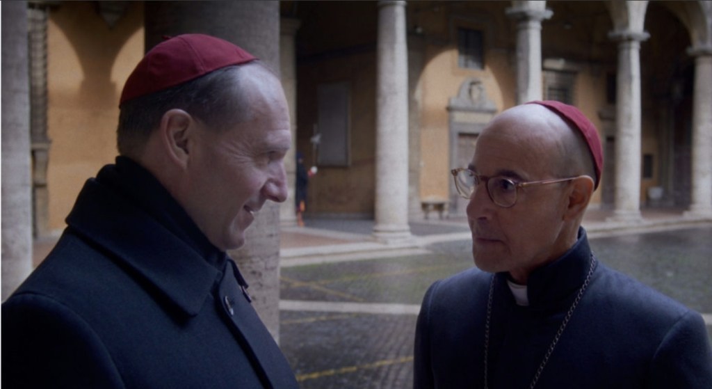 It also helps that he’s surround by a veteran cast who are positively chomping at the bit to sink their teeth into the drama of this thing and leading the charge is Stanley Tucci put-upon liberal candidate who is only putting himself forward to continue the previous Pope’s agendas, but as the votes come in, he starts to show his hand that maybe he’s not so resistant to the Popehood as he’s initially making out. Similarly we have John Lithgow in a toupee that weirdly makes him resemble Jon Voight from certain angles as a Cardinal who has a fair few secrets of his own that could aid him to the top; and then there’s Isabella Rossellini as a nun whose constant placement in the background means she knows a fair few secrets of her own.