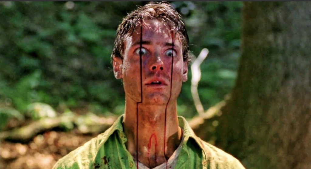 We open on a quartet of abysmally horny college students as they paddle their way down the rivers of West Virgina on a rafting trip and even though it’s seemingly been years since the last survivors of the mutant cannibal tribe have bothered anyone that actually been missed, these kids are about to be on the menu. After shooting an arrow through a woman’s boob, spearing a dude through the mouth and slicing another into three with a well placed hunting trap, both the maniacal Three-Finger and his kid protégée, Three-Toe (the mutant baby from the end of the last film) will no doubt have enough body parts to keep them fed for a while, but while they celebrate their haul, the fourth teen, Alex, manages to escape into the woods.