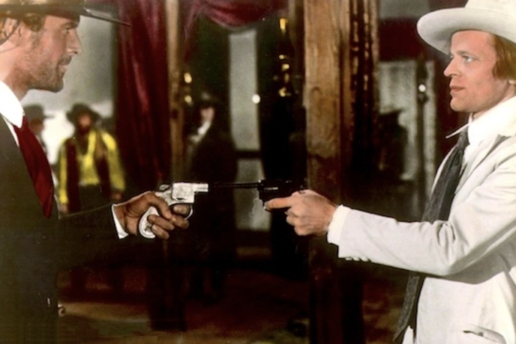 Thankfully, the movie realises that a stern, monosyllabic gunfighter who is a complete stranger to any sort of comeuppance is only as good as his wacky supporting cast and so we have a string of random bounty hunters, sidekicks and wild cards thrown in to keep the story ricocheting all over the place to the point where it’s almost impossible to follow. While many are merely single serving psychos and expendable henchmen, standouts include Frank Wolff’s affable tramp, Buddy Ben who seems to have Sartana’s back for… reasons; but almost stealing the show is the exceedingly strange Hot Dead who is played by the exceedingly stranger Klaus Kinski – again, a veteran of the Sartana saga after playing a completely different (and noticably dead) charscter in the previous film. A weird, needlessly gleeful goblin of a man, his whole deal is that he is a fucking terrible gambler who nevertheless cannot stop betting on literally everything; however, the silver lining is that he is a chillingly gifted bounty hunter that kills outlaws to fund his uttedly pathetic habit. In fact there’s numerous times where you kind of wish that Kinski was the main villain instead of whoever the hell it ends up being (I lost track in all the gunfire).