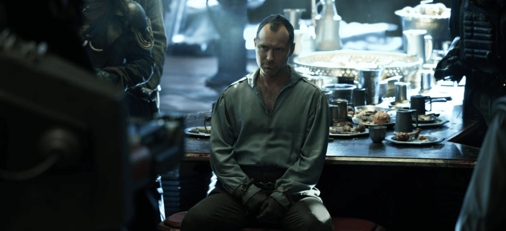 Meanwhile, Jod the pirate-jedi is immediately capture while trying to escape with the treasure and taken before Brutus, the pirate captain, and his former crew to be executed by being thrown out an airlock. In a scene that proves Jude Law’s movie stars credentials, and in classic pirate style, Jod is allowed to plead for his life, allowing Law to deliver a stellar uncut monologue. This is Jod’s crew, he knows them, and he appeals to their desires and Brutus’s greed to buy himself some more time and possible way out of his fate. Buying the explanation of what the treasure is, all the pirates are on the way to At Attin.