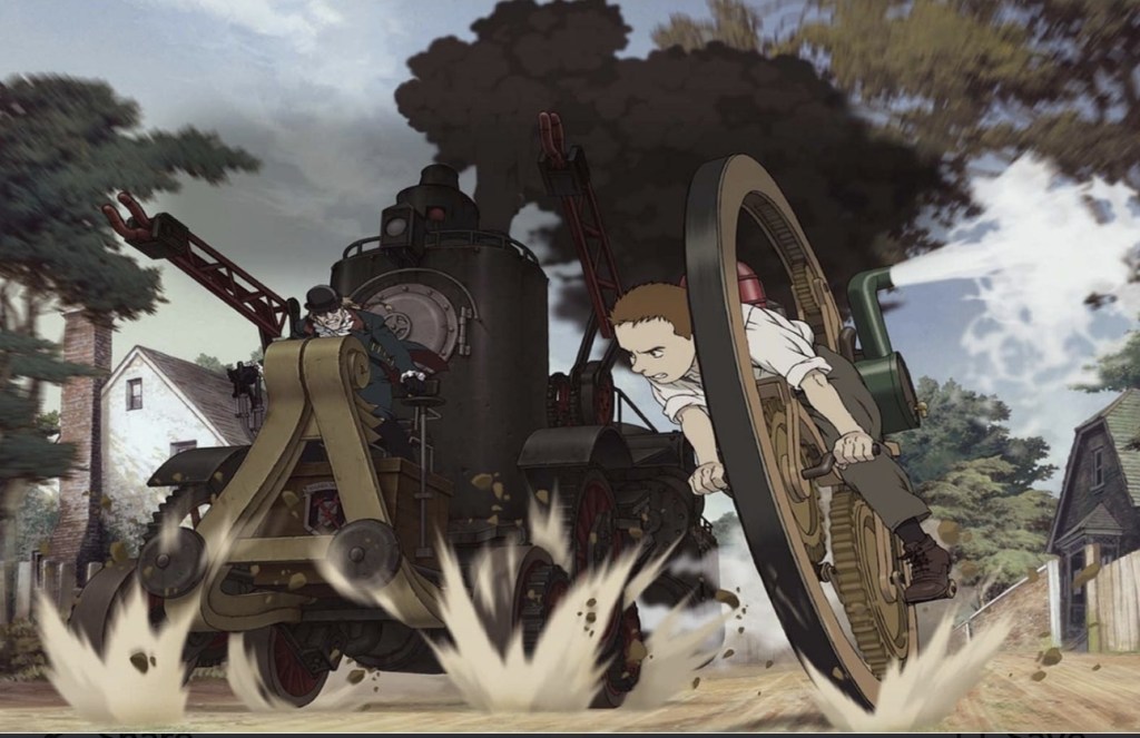 In fact, it’s greatly amusing that while James is torn between the equally fanatics beliefs of his manic grandfather and his semi-robot father, the most entertaining character by far is the incredibly petulant and selfish daughter of the chairman of the O’Hara Foundation, Scarlett O’Hara St Johns who simply cannot understand what all the fuss is about and cannot fathom why no one is putting her needs first. However, while the plot maybe somewhat simplistic, the world building and animation certainly is not and for sheer razzmatazz for the eyeballs, Steamboy is one animated adventure that certainly piles on the pressure.