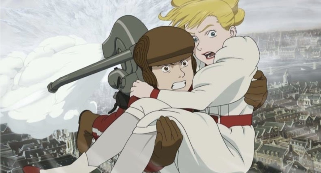 Once you get past the rather strange concept of everyone living in nineteenth century Manchester speaking perfect Japanese (unless you go dubbed of course), you are literally bowled off your feet by the ridiculously sumptuous world that’s laid before you as accurate streets and fashions of the period mix with retro-futuristic inventions that throw in tanks, blimps, tractors and jetpacks as the action slowly starts to grow and every single second of it is an awe inspiring joy to behold. While some Anime purists may turn their nose at 2D, had drawn animation mixing with 3D CG backgrounds, there is simply no way this movie could have been put together and the results are genuinely unlike anything I’ve ever seen before.