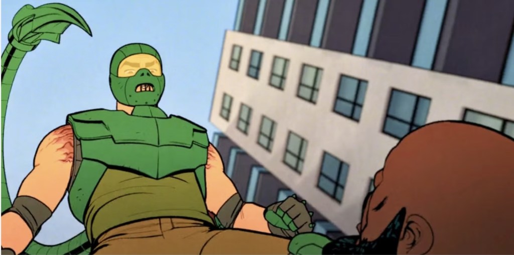 So while Spider-Man has passed all the usual Spider-Man tests and trials that mark him out as the hero that we love, Scorpion has become the rage-fueled thug complete with a comic accurate mask and Lonnie is gradually edging toward whatever comes next, that leaves two more characters still teetering on becoming superpowered pains in the ass. The first of these, the difficult, petty and egotistical, Otto Octavius, is pretty much lounging comfortably in supervillian-ville already – he just needs a set of lashing, metal octopus tentacles to complete the picture, but once again, it’s the progression of Norman Osborn that proving to be the most gripping. It seems that with every episode, he’s becoming more and more ruthless as his cutthroat nature rises to the surface like a crocodile on the hunt and our latest evidence is the way he visits Octavius in jail to callously crow over taking legal control over his rival’s life work and folding it into Oscorp. However, while a bit of corporate dick swinging may not completely be proof that Norman is actually piece of shit, the final scene reveals that Osborn has his fingers in quite a few questionable pies – one of which seems to be the creation of more genetically altered spiders in the hope that more people with Peter’s particular powers pop up after getting bitten. After episodes of watching Norman gradually showing his hand, this is the first hint of true, overt villainy he’s actually shown and to say that we’ve all been waiting on tenterhooks for this to happen is something of an understatement. In fact, while all aspects of YFNS-M have been firing on all cylinders, I have to admit, keeping tabs on how much of a problematic ass Osborn is becoming has become one of my favorite things and it’s almost like we’re being required by the state to keep an eye on him in case of any triggering behavior. In fact, the notion that the term “Hero Or Menace” could refer to a few of our characters means that even the titles of this episode are better written than some other shows I could mention.