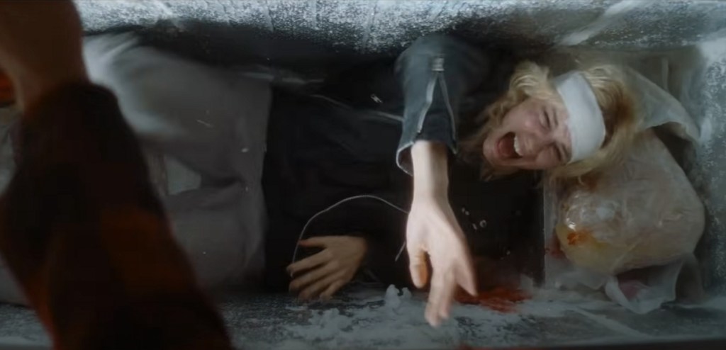 Right, now that my conscience has been eased by a timely warning, Strange Darling is something of a remarkable movie that will no doubt thrill some and enrage others – but then I have to say, if your modern day horror flick isn’t doing either – or both – are you even a modern day horror flick? Taking a rather big cue from the aforementioned Barbarian, Strange Darling does a few things that seem remarkably similar at first glance; both relentlessly fuck around with the pace of the story, breaking it up into mismatched sections to keep its secrets to much later in the running time and to keep us utterly unbalanced as to how this thing will ultimately end. It also delves into a lot of social conundrums considering the dangers that exist between the divide between men and women when it comes to trust and safety and has no qualms about going to some highly triggering places. Simply put, the movie is one of those stories that challenges our natural tendency to believe certain things based on instant first impressions simply because that’s what, as a society, we feel compelled to do. We see a man with a mustache and a pick up truck chasing an hysterical lady covered in blood and we instinctively know what is going on. However, Mollner is here to bring up some unsettling points that warn about the pitfalls inherent about such quick leaps of judgement and whilecsome will no doubt accuse the movie of suggesting that we shouldn’t believe victims, anyone who comes to that conclusion is missing the point.