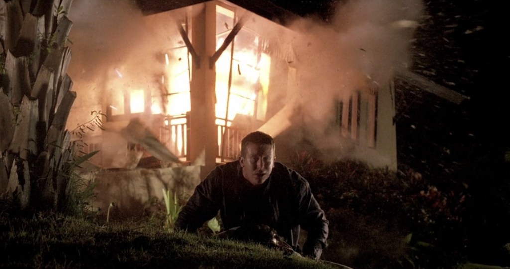 Joe Linwood is a Marine who, after a particularly harrowing mission that saw a child get caught in a crossfire, is taking some much needed leave to get his head together. However, while all he wants to do is just go home to Michigan and decompress, his loving life Robin has her high powered job to consider and pleads with her jacked, war weary hubby to join her. Luckily, her job is to arrange ceremonies and events for her entrepreneur boss, Darren Coleby, and the belligerent billionaire has tasked her with throwing the lavish bash that’ll signify the opening of his palatial resort in Thailand, so she and Joe jet off to paradise to soak up the sun. After a bit of dick swinging between Joe and his wife’s boss, they manage to settle down and even manage to befriend a grizzled old, burnt out, army vet who runs a snorkeling tour off the island, but the holiday is about to be violently cancelled when the opening ceremony is gate crashed by the worse kind of intruders.