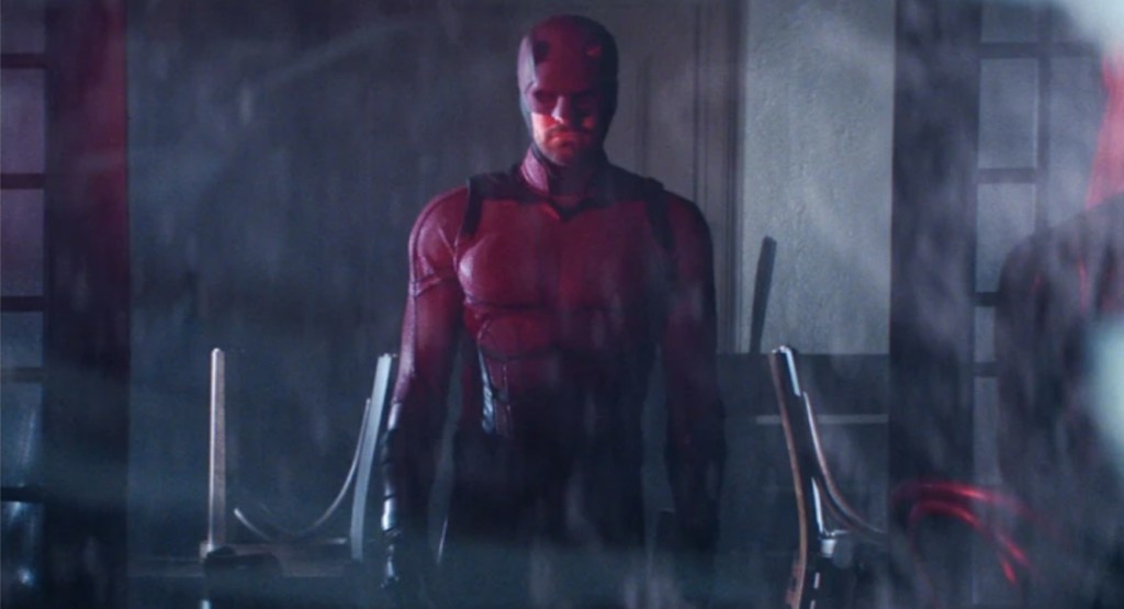 Still, while Born Again is more than happy to end on an awesome downer, I’d prefer to wrap things up on a positive note and when it comes to crowd pleasing moments that border of mythic, directors Aaron Moorhead and Justin Benson virtually pump the episode full of kickass fights and (literal) jaw dropping acts of gore that not only cause you to aggrssively roar like you’re at a football match, but actually work as genuine character moments. The main headline that’ll get people’s jaws wagging the most (another bad jaw joke) is a showstopping Kingpin moment that actually surpasses the beheading by car door moment from the original series that sees Vincent D’Onofrio literally rip a man’s mandible bone clean off of his face. Elsewhere, you can’t have a Daredevil bloodbath without the Punisher being invited and watching Jon Bernthal cut loose with knives, guns and, in one case, an axe is just a magnificent as you’d hope – but what proves to be even more satisfying is that the continued, edgy banter between him and Charlie Cox really stands out as one of the best things about the season. With Castle due to get his own, standalone, Special Presentation next year, it should fill in a few gaps left by an up in the air ending (make sure you stay tuned for the post credits sting), but it it could explore Frank’s reaction to an entire police force all wearing his logo, I’d really appreciate it, because we’ve barely scratched the surface and it’s a stunning image.