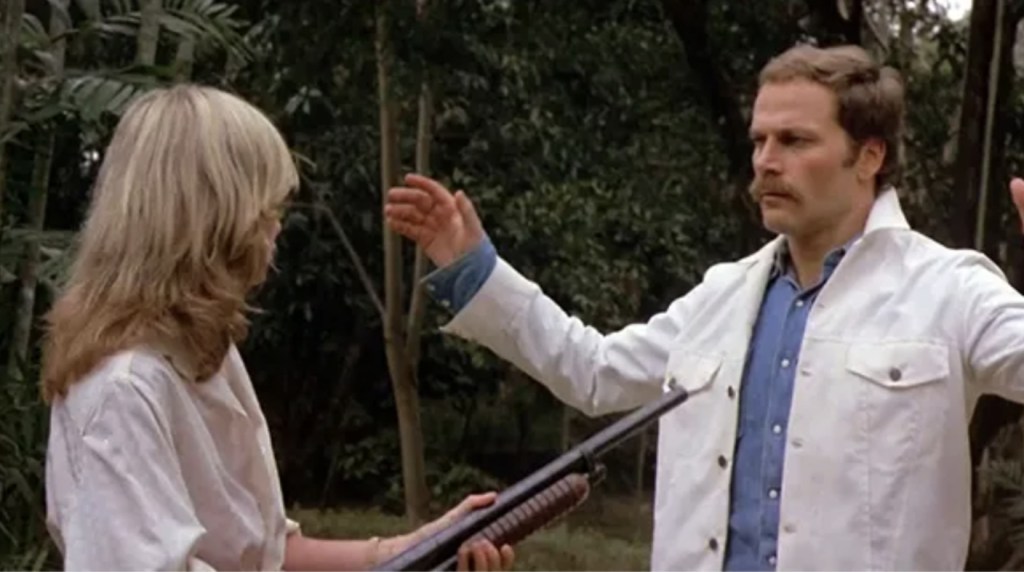 But wait, it gets worse – and by worse, I mean it ironically gets better – when the villains are rolled out and while Cole works his way up the criminal/corporate ladder through various street level thugs all the way up to snivelling henchmen with spikey arm prosthesis and British accented second in commands, we get to Christopher George’s utterly illogical arch bastard who proves to be a veritable gold mine of outlandish quirks. Sporting a voice so gravelly it makes Danny DeVito sound like Prince, the diabolical Venarius lounges in his office slash swimming pool, concocting various evil deeds while training synchronised swimmers to create his “masterpiece” in an act of confounding multitasking that Blofeld couldn’t hope to pull off on his best day. Rounding out the cast is an overacting Alex Courtney as Frank who seems to believe that all of life’s problems can be cured either by draining whatever liquor is close to hand or organising yet another cock fight at the drop of a hat – seriously, this guy fucking loves cock fighting – and Susan George who, apart from looking mighty fine holding a shotgun and who has to endure bring bound and gagged for the last twenty five minutes of the film, has the only remotely normal role of the cast.