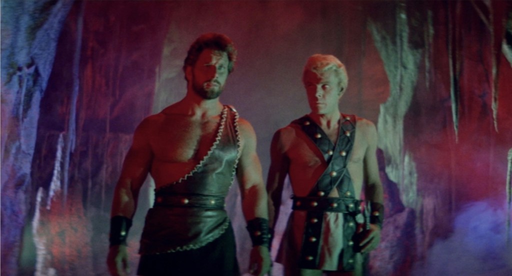 While watching Hercules In The Haunted World (aka. Hercules In The Centre Of The Earth), I couldn’t help but be reminded of Doctor Strange In The Multiverse Of Madness – think about it; both Mario Bava and Sam Raimi both are primarily known for their visual flare and their work in the horror genre, both saw them smuggle their talents into the fantasy/superhero genre to add a massive helping of the macabre into a series chiefly known for its daring do. It’s absolutely fascinating to me that the sort of tricks big franchises pat themselves back on the back now for utilising were being utilised as far back as the early 60s and beyond. A healthy dose of vitamin Bava takes what is a fairly standard fantasy film with all the melodramatic dubbing and styrofoam boulders and gives it a lush, gothic once over that elevates the material immensely. The sets (or should that be “set” singular, that was constantly redressed and re-lit thanks to Bava’s genuis with photography) are all awash with bold lighting and suggestive shadows. The horror aspect of the story is given an almighty boost by Bava’s kooky aesthetics that go above and beyond the call of duty and are instantly memorable such as Herc almost being fatally stabbed by a knife made out of three skeletal fingers and a truly nightmarish moment when a character seemingly drowns in slushy, yellowish lava which blatently must have traumatised a few kids back in the day.