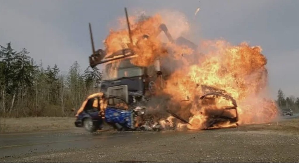 This is it. The big one. The boss. The mac daddy of mass deaths. There’s been plenty on instances where a moment from a Final Destination movie has wormed into our consciousness to stab us with a pang of fear in our say to day lives, but while we’ve harvested a healthy wariness over such things as tanning beds, rollercoasters and stepping backwards into the road without looking, nothing – and I mean nothing – has penetrated our consciousness more than driving behind a truck filled with logs.
