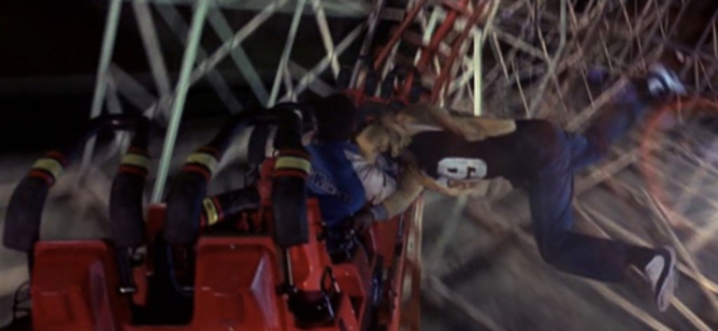 Rollercoasters are fucking weird things, right? I mean no matter where you use one, you never feel entirely safe, especially if they’re one of those old ones run by swiftly looking carny folk and one of the accomplished things that the Final Destination movies manages to achieve is to realise the best, worst case scenario for every non-day to day task you can imagine. Now, even though there’s an argument to be made that the rollercoaster scene from movie 3 isn’t as frantically batshit as the speedway sequence from 4 (most of the victims fall screaming to their deaths offscreen), it’s far easier to relate to a shitty fairground ride going tits up than watching racing cars go blammo.