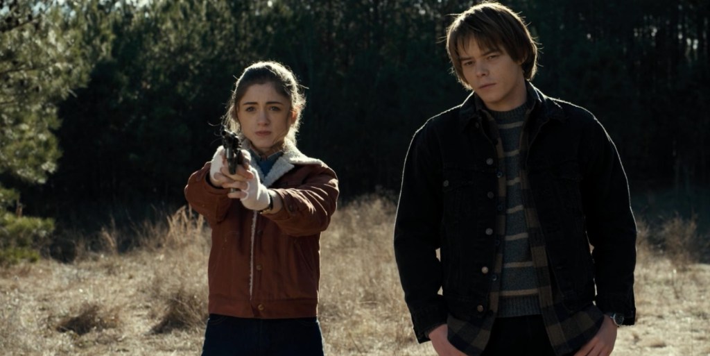 He takes this information to Joyce, who has been having an especially bad time of it as she’s had to endure her son Will’s “funeral” and the fact that her worthless ex-husband has only gotten involved in order to nail someone with an unlawful death lawsuit for the money. However, after days of being treated like the town looney, finally getting an affirmation that the body lying into that coffin is not her son is the hopeful news the poor, traumatised woman has been hungering for since Will vanished. However, this news is yet to reach Will’s older brother Jonathan, who has teamed with Nancy in order to try and explain the disappearance of her friend Barb and as they arm up with a baseball bat and a hun stolen from Lonnie’s glovebox, they head into the woods to see what they can figure out.