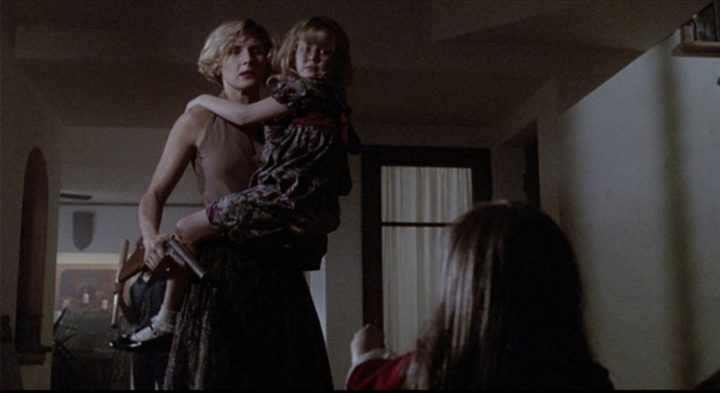 In fact, shitty parenting seems to be vital to films like this and considering that Denise Crosby had already witness one cinematic forces tear her family a new asshole in Pet Sematary, you’d think that maybe the former Star Trek actress would realise that cinematic homemaking possibly wasn’t for her. It doesn’t help that the obscenely precocious character of Jimmy is used as the sort of comic relief that would have played well in The Monster Squad, but seend incredibly misplaced here, even if I’ll freely admit that his shotgun blazing moment of glory (along with the kiss-off line “Play with this, bitch”), is B-movie heaven. I will say that little Jessica (who looks a lot like an E.T. era Drew Barrymore) does a fairly admirable job of portraying the child in peril and you can see that along with Child’s Play, Dolly Dearest was hoping to pinch a fair bit of material from The Omen too – jeez, there’s even a dog attack in a graveyard and a reveal of a misshapen baby skeleton just to really drive things home.