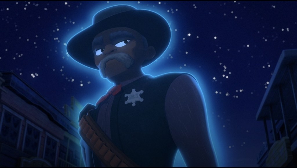 Meanwhile, in an effort to score some free fuel, Chang is trying to charm the townsfolk by telling them stories about Sam’s slightly exaggerated adventures as the ghost fighting Kid In The Hat, but this promptly backfires when the denizens steal their truck and refuse to give it back until Sam deals with the ghost problems currently afflicting Innocence. It seems that the spirit of the disgruntled lawman, Marshall Bass Reeves, has taken umbrage that the founders of Innocence are all former outlaws who put all their ill gotten gains together to build a new life for themselves in the form of the town. While Reeves can’t actually physically bring any of these one time criminals in, his plan is to strafe Innocence every night with his exploding silver dollars that he flings about the place like the Green Goblin when there’s a sake in pumpkin bombs until the townsfolk turn themselves in.