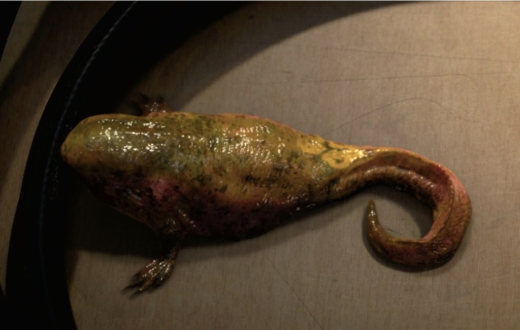 I guess my opening let the cat out of the bag somewhat, but yes, the strange chittering sounds that Dustin has been hearing coming from his bins turns out to be a tiny, thumb-sized newt-like creature that the excitable kids smuggles past his mother and into his bedroom. Naming the little squisher D’Artagnan (Dart for short), Dustin starts voracious studying various lizards and pond life to try and find out what his new discovery is but ultimately draws a blank.