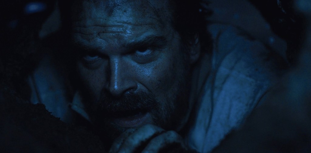 OK, so we’ve got a lot to pack into this synopsis, so hold on tight. The last time we saw Hopper, he was digging up one of those rotting pumpkin patches on a hunch that proved to be bang on the money. The corruption that’s been affecting all those crops has been coming from some very Upside-Downish looking vines that’s spreading out for miles under Hawkins, but as this seems to be some form of fucked up terraforming, Hopper soon succumbs to the alien atmosphere. Meanwhile, Will, now connected to the cloud monster by an act of possession now realises thanks to Mike that he can spy on the creature’s thoughts and soon has a vision of Hopper in deep, vine relayed shit. Enter Joyce’s boyfriend Bob whose love of puzzles means that he deciphers Will’s complex maze of interlocking scribblings to point out that it’s actually a map of Hawkins. Using Bob’s smarts to figure out exact where Will’s vision puts Hopper, they all speed out to save the day before the police chief is choked to death by evil vines.