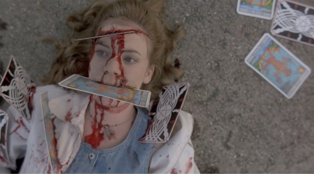Next up is future Oscar winner Hillary Swank who, after once being the Next Karate Kid, now finds that demon punks stand between her and being taken seriously as a young, up and coming actress but once again, like Gross, while she’s immensely forgettable as she goes through the horror heroine motions, she’s giving it the old college try – even when a dream sequence has her rutting on the misshapen form of a demonic Tony. However, when it comes to the late Alexis Arquette (who went on to star in Children Of The Corn V only two years later – yeesh, tough break), I find myself with something of a conundrum. The actor attacks the villain role with such a blatent disregard of anything even remotely approaching subtlety that I genuinely can’t decide if it’s the worst or best thing about the movie by far. As Arquette zips about the place, spitting out sub-par Freddy Krueger puns and gurning at everyone with demonic contact lens, you can’t exactly claim that it’s dull. Yes, amassing a body count that includes conjuring vines to pull someone into the earth so a lawnmower can run over their head and throwing tarot cards into someone like ninja stars may not be the most dignified ways of killing people, but it’s certainly more fun than anything anyone else is doing. Also, I feel that I have to bring up that the demon makeups for Tony and his two goons are actually pretty damn good, especially the moment where one emerges from a hellpit in order to give the cameraman a big old eyefull of his gnarled body and its a shame that they weren’t featured more.