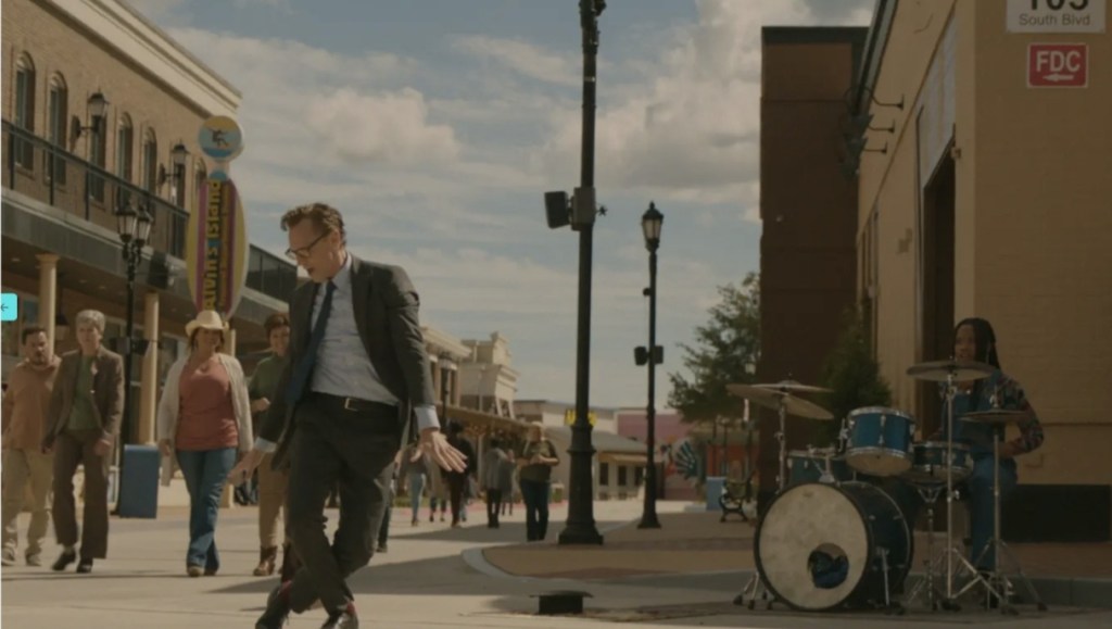 In the second Act, Buskers Forever, we zip back nine months to meet Chuck himself, an unassuming accountant who is out of town at a conference. But as he’s going about his business, he comes across a busker who is tapping out a beat with her drum kit that gives him the urge to start dancing in time to the rhythm leading to a magical moment. But as we move further back to the final (re: first) act, I Contain Multitudes, we watch Chuck as he’s brought up by his grandparents after his parents and unborn sister are killed in a car accident.