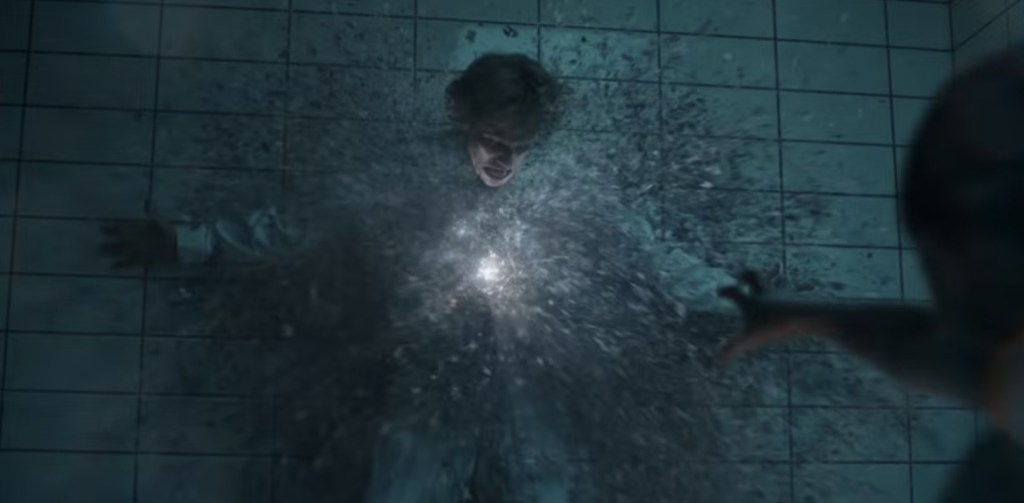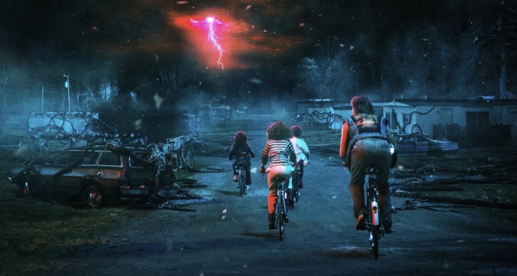The rest of the episode is dedicated to explaining the origin of Vecna that reveals that we’ve zeroing in on his backstory from multiple angles. While one plot line finally plainly lays out what the puckered motherfucker is doing and why, another reveals that Vecna did indeed have something to do with Creel murder as he was the misanthropic son of the family who fancied using his telekinetic brain to punish his peers. But we find out that Eleven was on his case too as her flashbacks reveal that a pre-Vecna Henry Creel was one of Brenner’s first experiments and subsequently responsible for the Hawkins Massacre that Eleven mistakenly blamed herself for. With that, we watch the diminutive powerhouse mind wrestle with her former mentor and push his psychotic ass into another dimension which not only ravages his body into the twisted form that’s been haunting Hawkins. However, while this noticeably long episode is truly obsessed with laying down the plot, admirably it never does so at the expense of the characters – Dustin may be an exposition machine, but the legitimate joy in his eyes as he breaks it all down is catching. Elsewhere, there’s a truly nice moment between a shaken Eddie where he bonds with Steve over the fact that Hawkins’ most prominent haircut is actually a good dude. Visually, it’s good to be back in the Upside-Down once again as the sight of several characters biking through a landscape dotted with crimson lightning amusingly looks like The Goonies are cycling through Hell and those Elm Street shades grow ever more vibrant when Vecna targets Nancy to lay out his childhood (Nancy is also the name of Freddy Krueger’s most persistent nemesis). Even those old Poltergeist vibes return when Dustin and company throw a sheet up into a portal leading to the physics-busting sight of the real world literally sitting on top of its inverted dark twin.