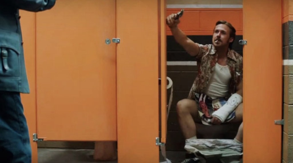 On the flipside, Gosling is something of a goddamn comedy revelation as he embraces his inner schmuck and steadfastly refuses to let go. From blurting out classic Black-isms like “You know who else was just following orders? Adolf Hitler.” and clumsily slicing his wrist open while trying to simply break open a window, to displaying the kind of physical genius usually displayed by comedy legends of days gone by, he effortlessly channels the skills of Charlie Chaplin and Lou Costello into his performance. Watching him struggle to keep a toilet door open while keeping a gun trained on someone as his cigarette drops into his lowered trousers proves to be just as delightful as watching the zig zagging plot get eventually straightened out thanks to some a mixture of decent detective work and sheer, idiotic, dumb luck.