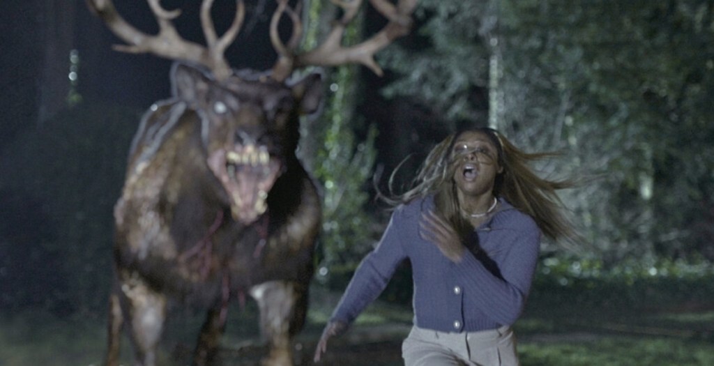 Of course, that doesn’t mean that Bambi: The Reckoning is good enough to score a three star rating, because for a lot of its runtime, it continuously keeps tumbling down the standard pitfalls the franchise has always suffered from. For a start, there’s a bit too much wandering in the woods going on that relentlessly pad out the story and it certainly doesn’t help that a clutch of underwritten characters are mostly played by actors who struggle to nail even the most natural sounding line reading. Furthermore, there’s a weird subplot going on involving the dementia suffering matriarch of the family who appears to have some sort of connection to Bambi that’s never actually explained. Not only has she been scribbling pictures of the hulking stag like she has some sort of unexplained supernatural connection to it despite the beast no having supernatural origins, but her dementia is seemingly (and ridiculously) cured by a climactic explosion so the whole sub-plot is left hanging in the air and also, the continuing family drama between Xana, Simon and little Benji is about as involving as watching deer shit.