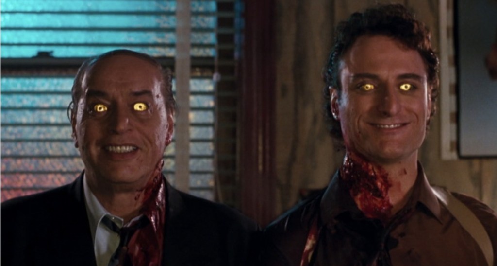However, the main reason that Innocent Blood simply can’t be discounted is thanks to the full-on performance of Robert Loggia who, when he isn’t chewing necks and guzzling blood, is inhaling huge chunks of the scenery as he makes Sal the Shark a formidable, volcanic tempered maniac before his brush with Maria gives him eternal life and a thirst for the red stuff. In fact, his world challenging, defiant rant where he says super villain shit like “I am the power!’ and “I can fucking smell your dreams!” while fully ablaze should have been a show stopping moment of 90s horror, but as he’s abruptly stopped seconds after, it sadly loses all of its effect.